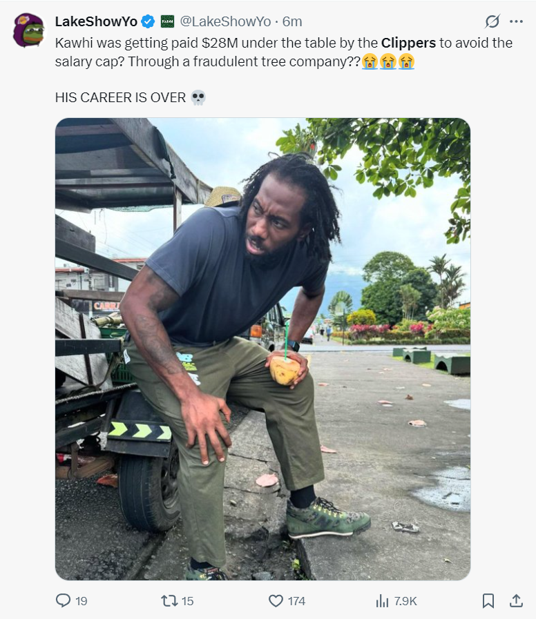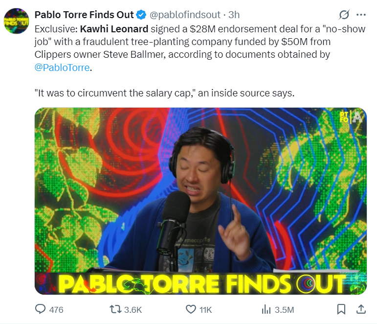 湖人媒体LakershowYo写道:伦纳德竟然通过一家欺诈性的植树公司私下从快船领取2800万美元的薪水,以此来规避薪资上限??这简直太荒谬了,伦纳德的职业生涯要结束了?