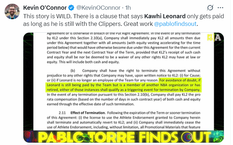 NBA记者凯文-奥康纳翻越了这些签约文件,其中有一条十分的离谱,他说道:这件事很离谱,其中一条规定是——只要科怀-伦纳德还在快船队效力,那么他就能每年领到薪水。干得漂亮啊!